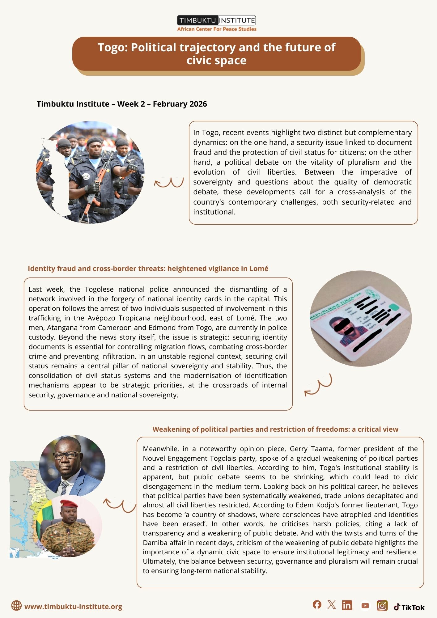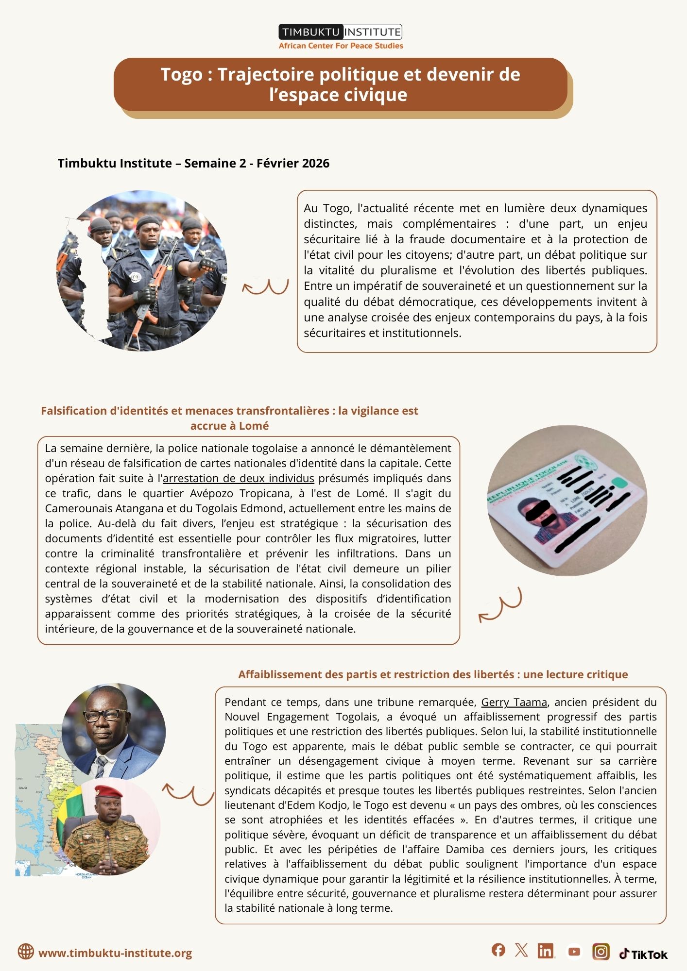 In Togo, recent events highlight two distinct but complementary dynamics: on the one hand, a security issue linked to document fraud and the protection of civil status for citizens; on the other hand, a political debate on the vitality of pluralism and the evolution of civil liberties. Between the imperative of sovereignty and questions about the quality of democratic debate, these developments call for a cross-analysis of the country's contemporary challenges, both security-related and institutional.